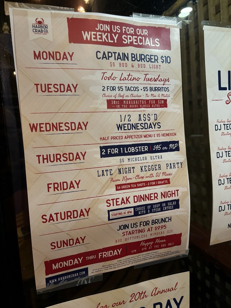 Welcome to Harbor Crab, a vibrant American dining experience located in Patchogue, NY. This establishment offers a diverse menu featuring burgers, seafood, and vegetarian options. The restaurant provides various amenities such as delivery, takeout, catering, outdoor seating, and private dining. Their famous starters include Mussels White, Baked Clams, and Maryland Crab Cakes. For entree salads, try the Classic Caesar or the Cobb Salad. The Raw Bar offers Oysters on a 1/2 Shell, Chilled Seafood Platter, Shrimp Cocktail, and Clams on a 1/2 Shell. Harbor Crab boasts a full bar with Happy Hour specials and a welcoming atmosphere for groups and families. With a focus on quality ingredients and attentive service, Harbor Crab is a must-visit dining destination in Patchogue.